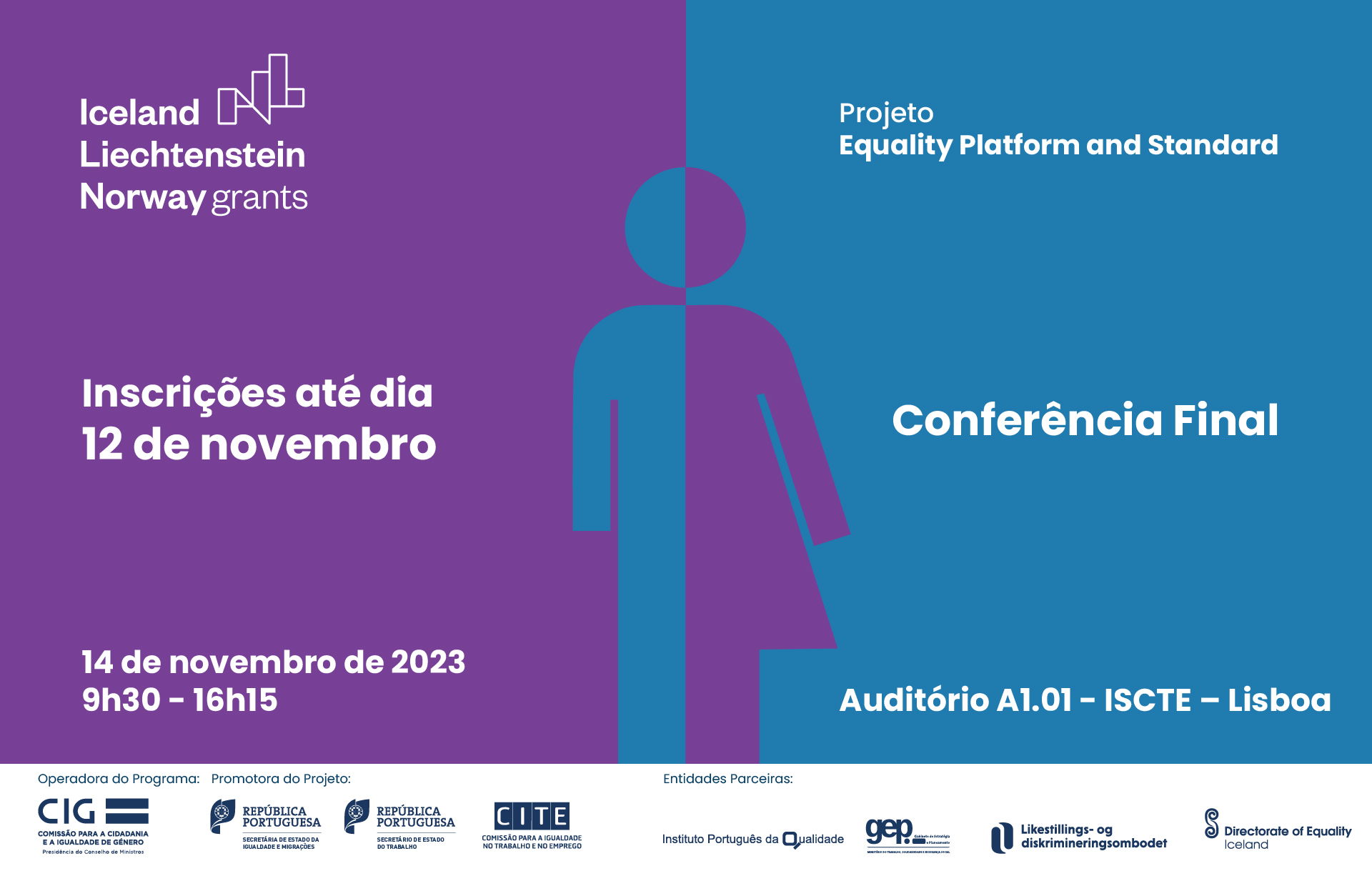 A conferência final do projeto Equality Platform and Standard é promovida pela Comissão para a Igualdade no Trabalho e no Emprego – CITE, financiado pelo Programa Conciliação e Igualdade de Género, do Mecanismo Financeiro do Espaço Económico Europeu 2014-2021 (EEA Grants).